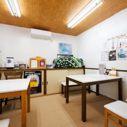 【入って左手は小上がり席】土足厳禁で、靴を脱いでリラックスできる空間。4名様掛けテーブルが2卓あり、5~10名様でのご利用に最適です。職場の部署飲みや、ご家族での団らんにもぴったりです。座布団でくつろげるので、小さなお子様連れやご年配の方も安心。まるで実家に帰ったような温かさです。