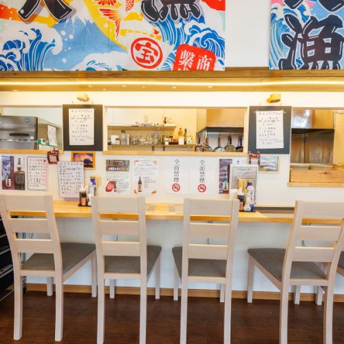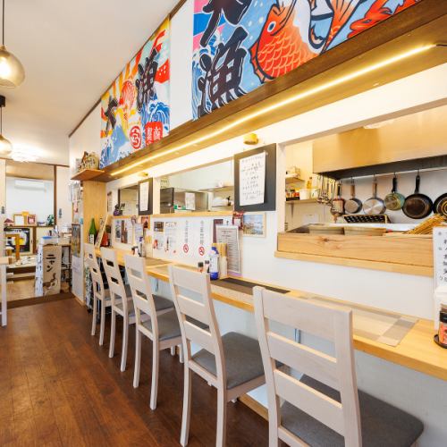 厨房の活気を感じるカウンター席は、お仕事帰りの一人飲みに最適。Wi-Fi完備でゆったり過ごせます。
