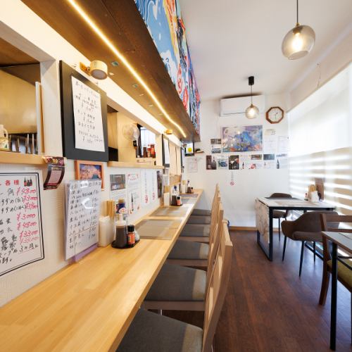 【入って右手はテーブル&カウンター】厨房の活気が伝わるカウンター6席と、2名様掛けテーブルをご用意。DIYで仕上げた木の温もりある内装は清潔感があり、女性のお一人様やランチ利用も快適に過ごせます。WiFi完備で動画を見ながらの食事もOK。仕事帰りのサク飲みや遅めの夕食利用も大歓迎です。