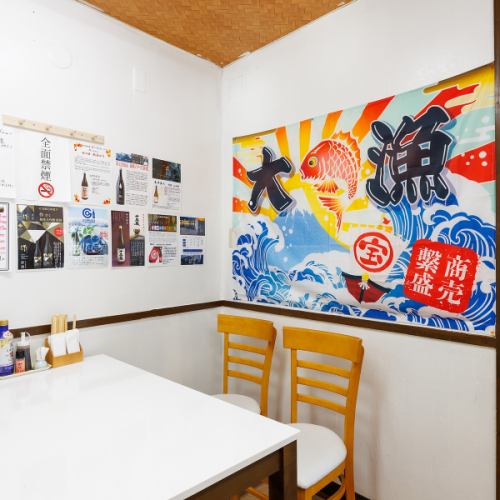 2名様掛けのテーブル席は、カップルやご夫婦、友人との語らいにぴったりの空間です。木目を基調とした明るく清潔感のある店内で、隣り合って食事を楽しめます。